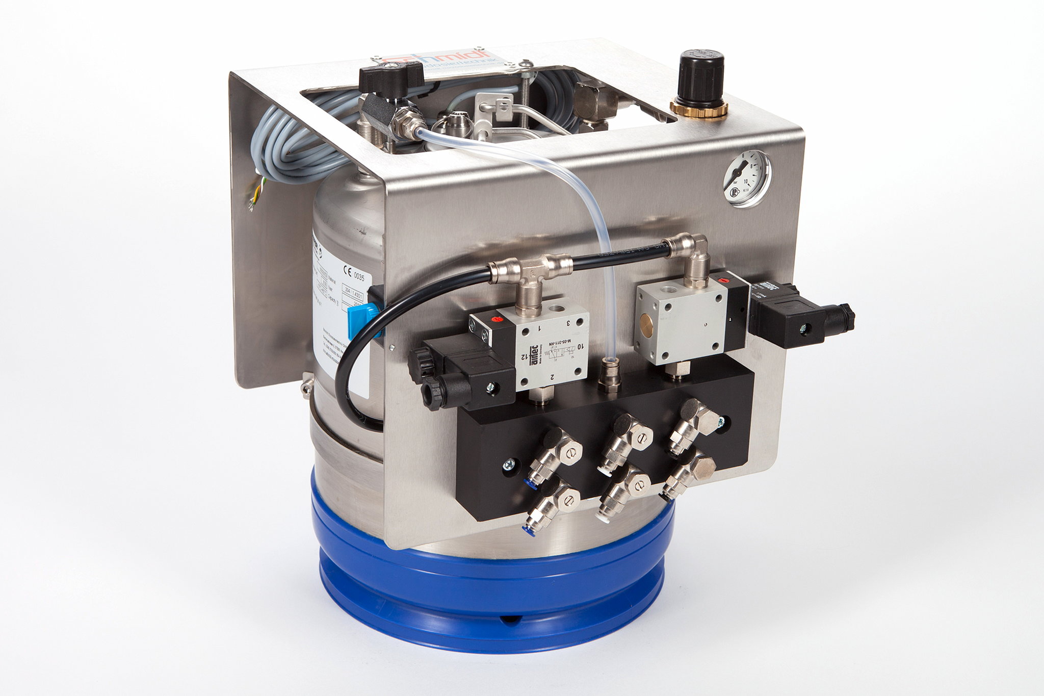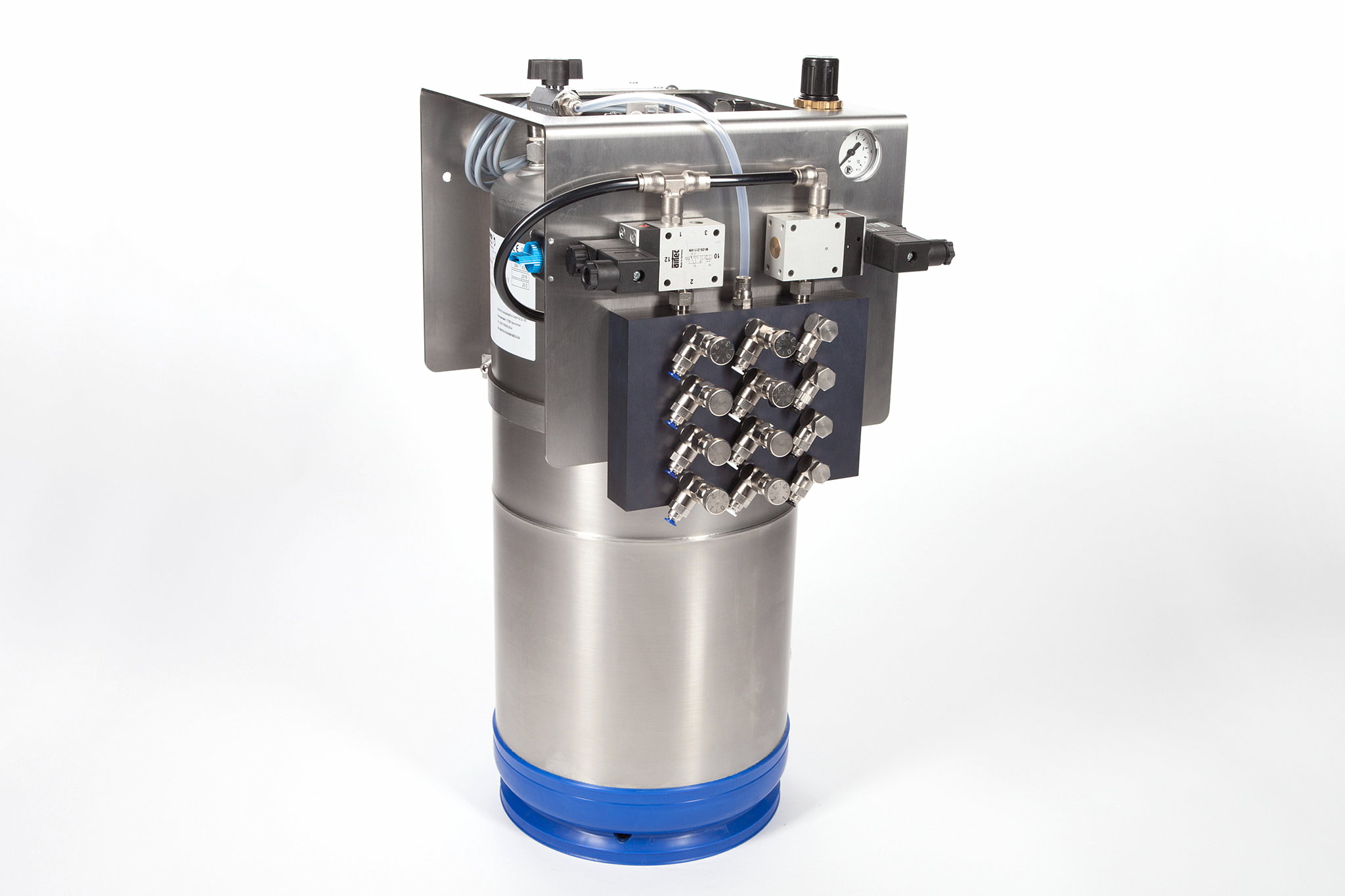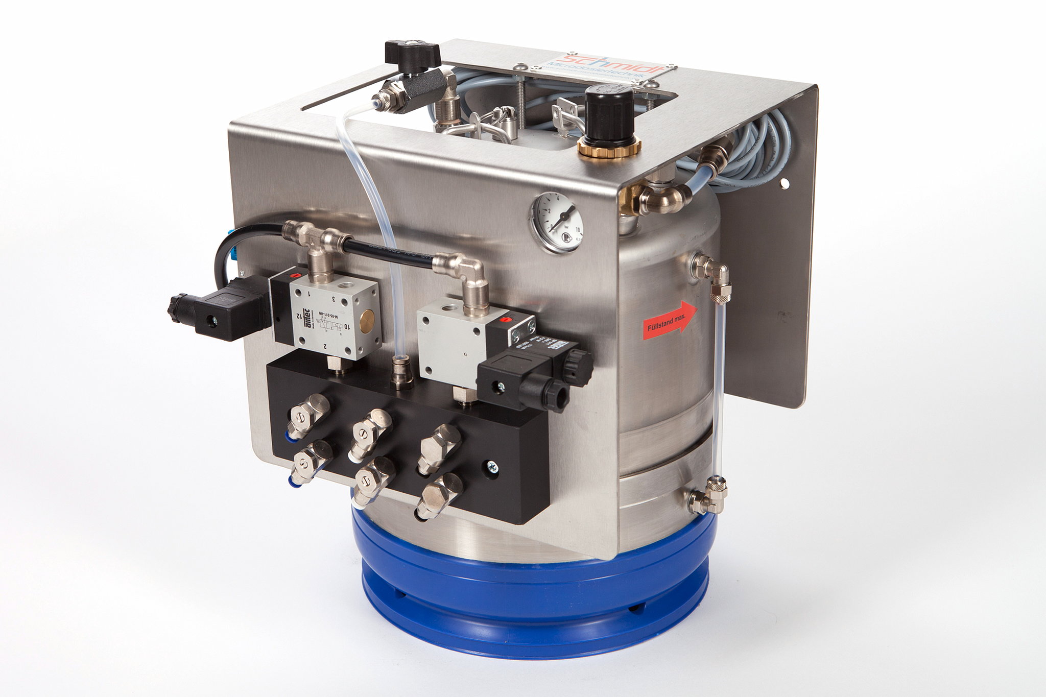 Sprühgeräte von Schmidt Microdosiertechnik werden standardmäßig mit Verteilerplatten für ein bis vier Düsen ausgerüstet. Weitere Verteilerplatten oder Düsen können im Baukastenprinzip ohne großen Aufwand nachgerüstet werden. Die Düsen können über die Verteilerplatten synchron oder getrennt angesteuert werden; Behälterbasisstation für unterschiedliche Anwendungen und Zuordnungen.